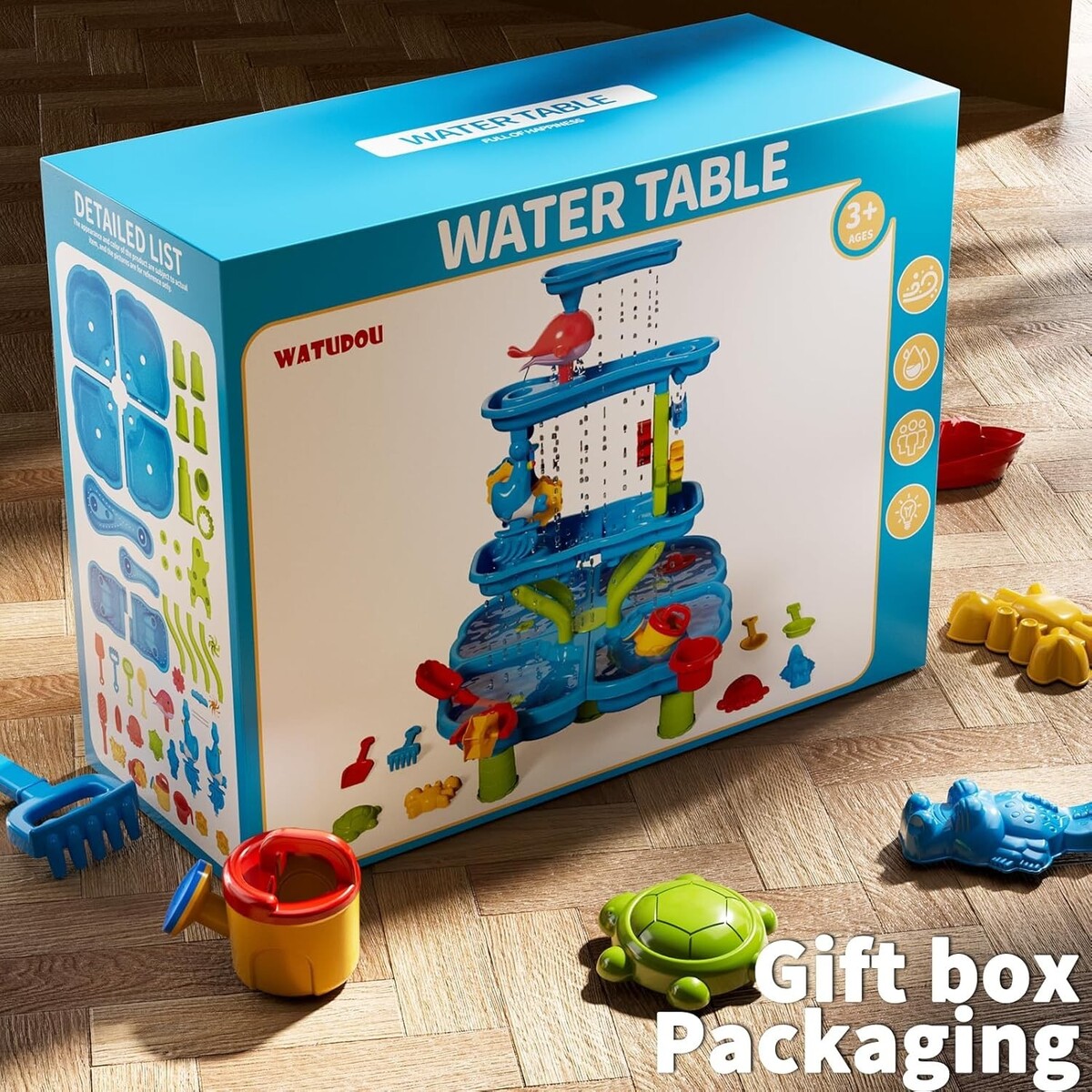 4-Tier Water Table: Our kids water table comes with many beach accessories (watering cans, buckets, marine life molds and various beach shovels) and water toys (windmills, water wheels, slides, boats) for players to play, providing a variety of ways to play, allowing children to develop fine motor skills and hand-eye coordination while stimulating their imagination, and enjoy hours of fun.