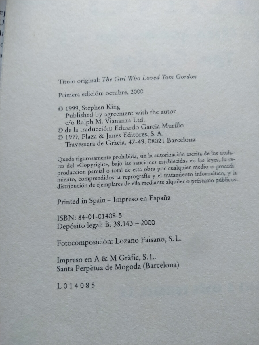 The Girl Who Loved Tom Gordon STEPHEN KING 2000 P&J - Spanish Book