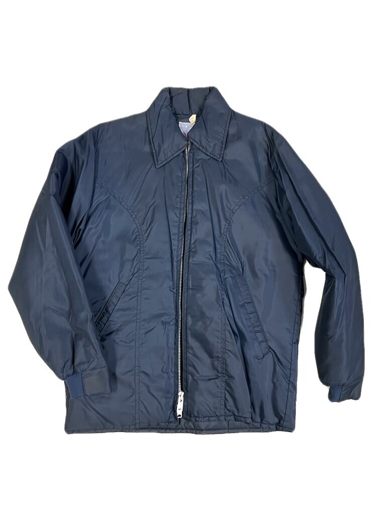Vintage 1960s Skimeister by Woolrich ski jacket, men?s large, in a vibrant retro ski blue with subtle sheen. This piece is new without tags (deadstock condition), unworn and preserved as a true slope-style time capsule. Features include secure zippered pockets, a straight hem, and the quality construction that made Woolrich a trusted outdoor brand for generations.