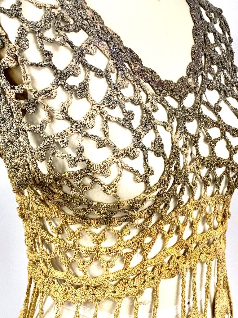 Very unusual item, I am not sure if it is vintage or not, but it is super cool. Has a retro hippie vibe, with the leaf style fringe. Its crocheted of gold metallic thread, I think silk, and in an ombre look that blends into green with a little pink. Wear over a swim suit, tank top, cami. It's a work of art.