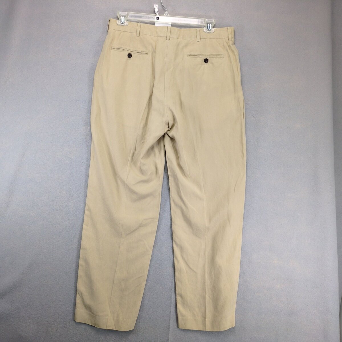Features: Relaxed Fit, Straight Leg, Mid Rise, Slash Pocket, Chino Style, Pockets, Belt Loops, Breathable, Lightweight, Solid Pattern, 35 in Measured Waist, 32 in Inseam, Button Zip Closure, Leg Crease, Dry Clean Only