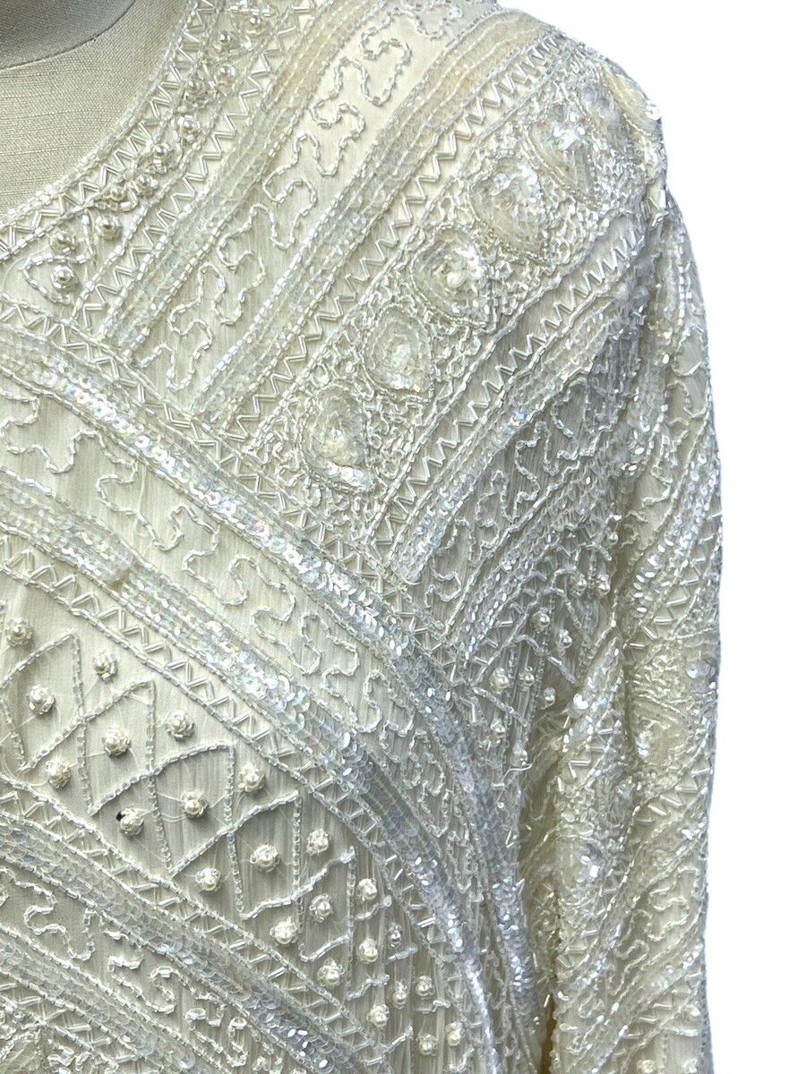 Exquisite vintage Diane Freis Original long jacket, marked size XL, crafted from flowing ivory silk and lavishly adorned with heavy beadwork. The meticulous hand-applied beading creates a shimmering surface of texture and detail, balanced by the relaxed drape of the silk. A true statement of elegance, versatility, and enduring style.