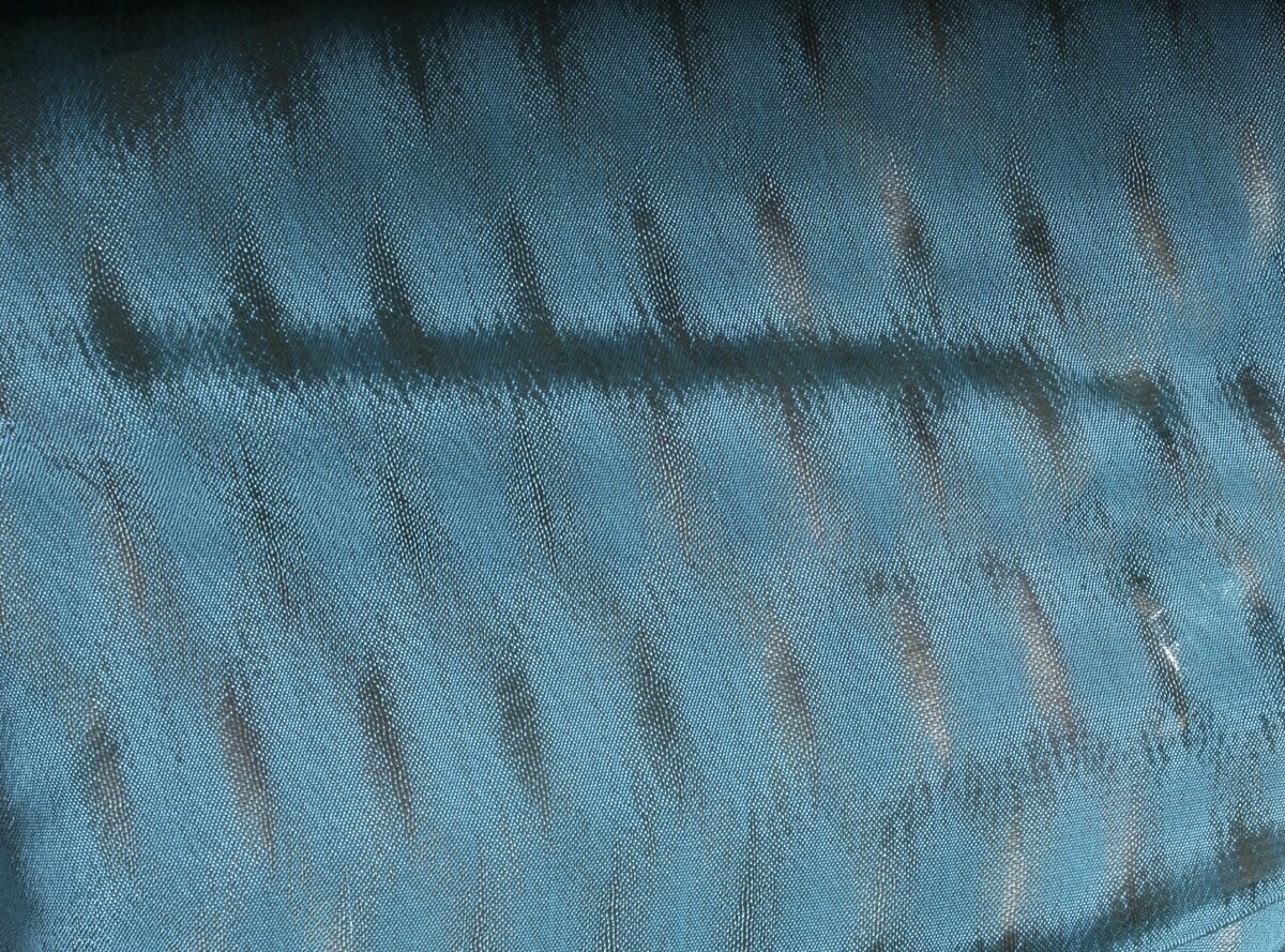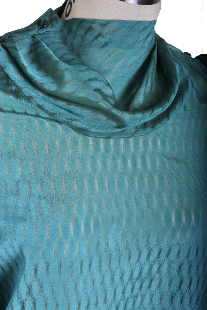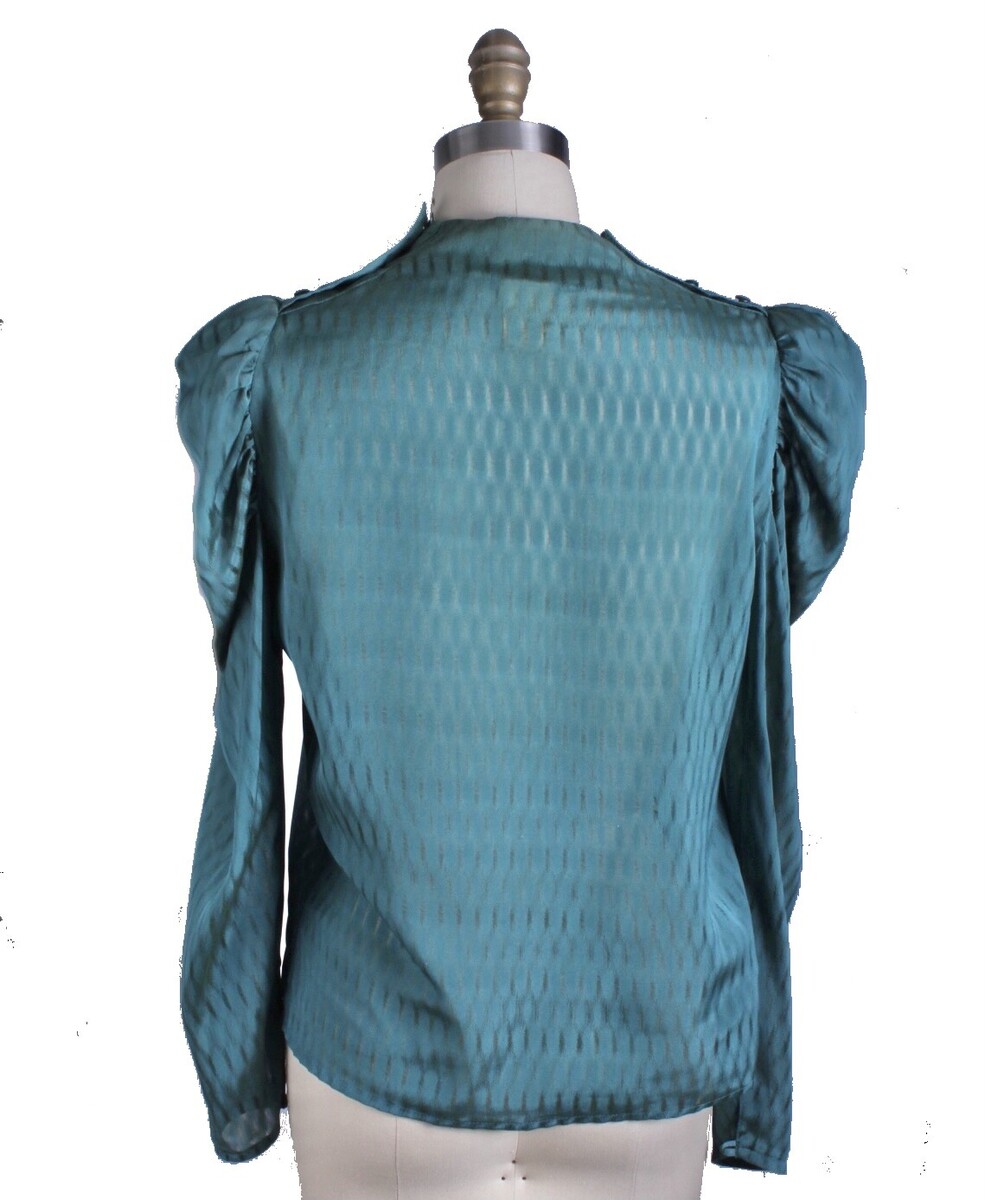 Semi-sheer woven synthetic blend; iridescent teal; high collar; mutton sleeves.