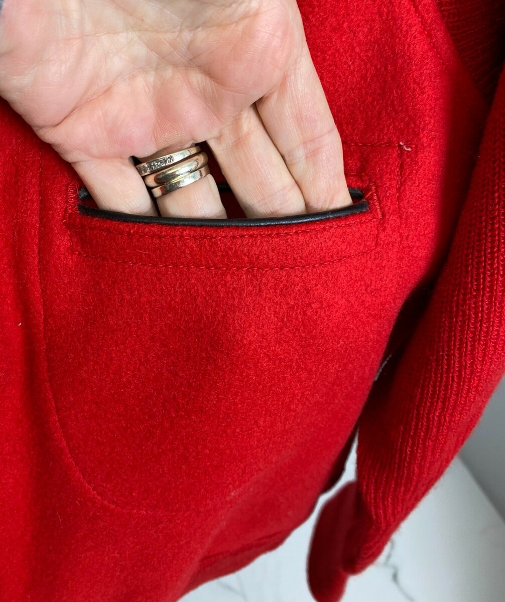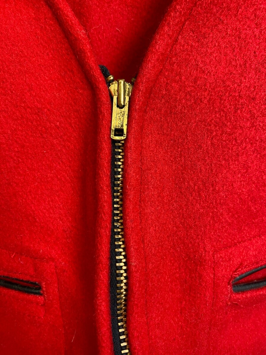 Provenance Note: Jackets like this, marketed under the ?Vestee? line by Hart Manufacturing, were a mid-century hybrid between sweater and jacket ? casual, stylish, and popular among young men in the late 40s?50s. The boiled wool body, Talon zipper, leather trim, and union-made construction highlight quality details of the era. Surviving deadstock rockabilly pieces in bold red wool are exceptionally rare and highly collectible.