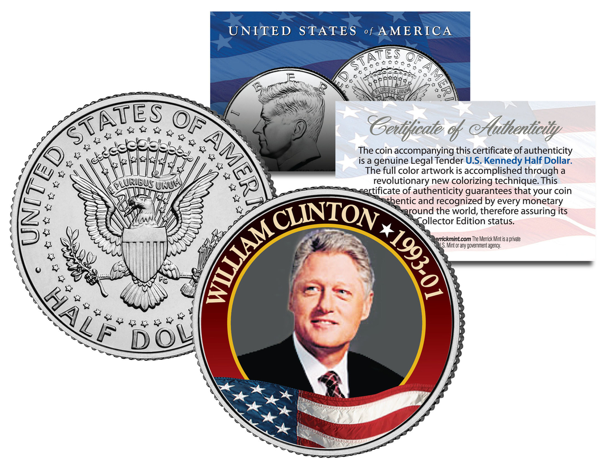 William Jefferson "Bill" Clinton was the 42nd President of the United States, serving from 1993 to 2001. Here is your opportunity to own or to gift the ?WILLIAM CLINTON ? 1993-2001? colorized JFK Kennedy Half Dollar U.S. Coin, which has been enhanced with a beautifully colorized image by the Merrick Mint. Each coin comes in a premium coin capsule with a full color Certificate of Authenticity to guarantee that your coin is authentic and recognized by every monetary authority around the world, assuring its Collector Edition status. This Legal Tender United States coin has been colorized with an application of special inks directly to the surface of the coin, using a unique and painstakingly multicolor coin process, which achieves a level of detail, color saturation, and durability that is #1 in the coin industry. The result is an everlasting colorized coin collectible of ultra-high quality. The Kennedy half dollar is a U.S. fifty cent coin with coin year and mint marks chosen at random.