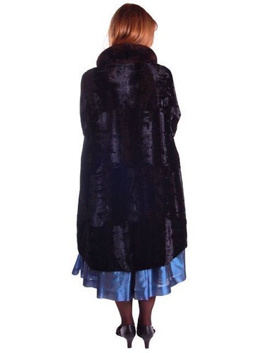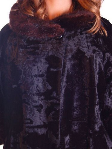 Crushed silk velvet exterior; brown mink trim at sleeves and collar; black satin lining; single neck button; inset side pockets.