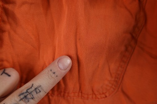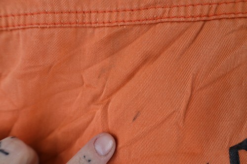 Blemishes both pockets, back top. Discolored throughout. Color faded. Arms frayed