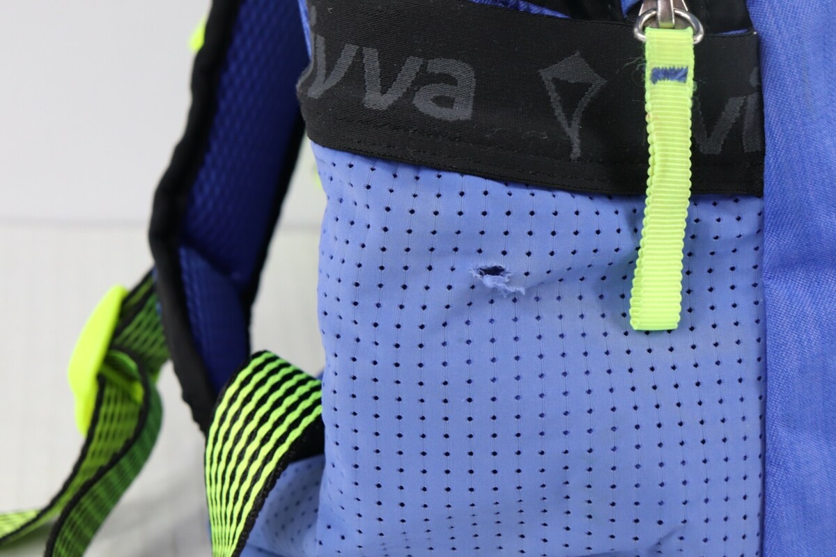 Comes from a smoke-free household. There is a small hole in the side pocket of the bag.