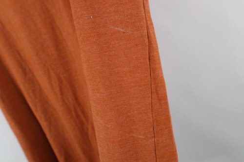 Hole left side hem. Stains front, inner lining. Dark spots back. Collar, armpits discolored. Has pilling. Color faded