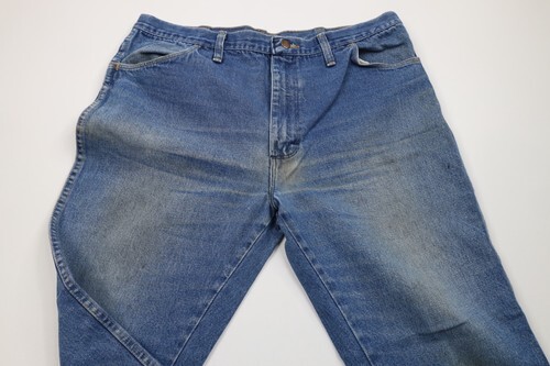 Threadbare spot upper back. Stains and distressing front and back. Inseam hemmed. USA made