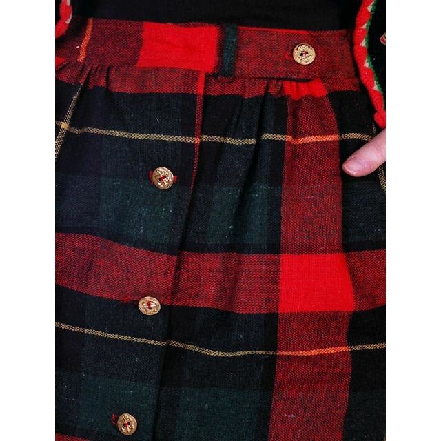 Vintage 1980s Stonybrook wool pencil skirt in bold red, green, and black plaid, designed in a 1950s revival style. Features two slash front pockets, a button-front closure with brass anchor buttons, and light waist gathers for flattering shaping.
