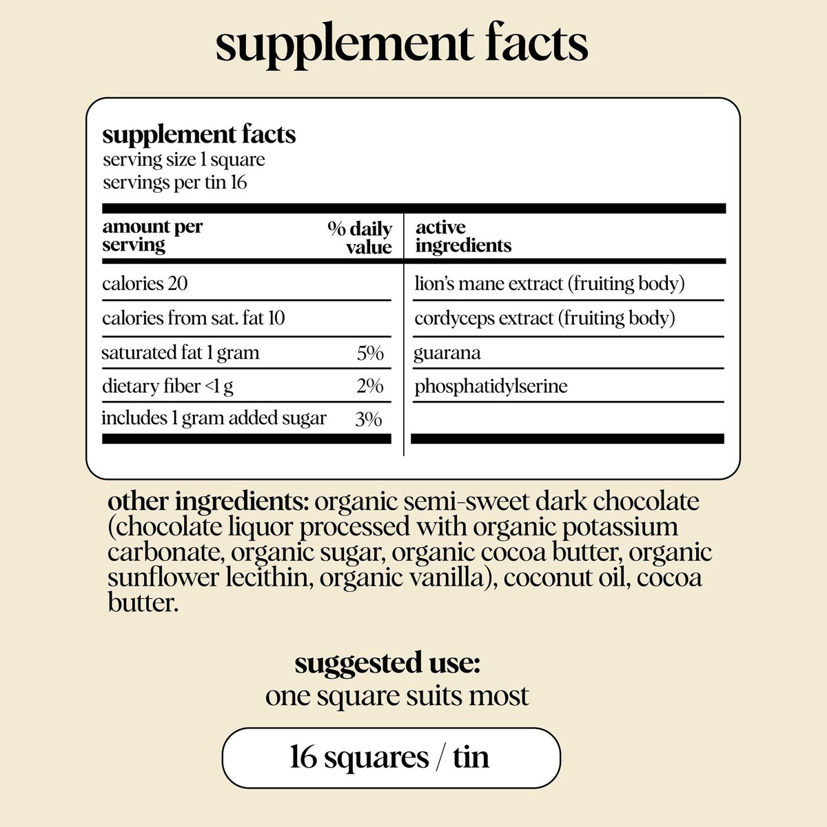 Expiration Date of 12/1/25 ? Premium Quality Ingredients - Brainstorm features fairly traded organic dark chocolate, organic Lion's Mane and organic Cordyceps from 100% fruiting body mushrooms, guarana, and phosphatidylserine. Vegan, gluten-free, dairy-free, and kosher with 66mg of natural caffeine ? Effective Cognitive Support - Our unique formula boosts long-term cognitive function while providing immediate focus and energy. With functional mushrooms, Guarana, and Phosphaditylserine, Brainstorm offers both instant gratification and lasting benefits ? Flexible Dosing Options - One Brainstorm square is ideal for most, delivering sharp focus and clean energy. For stronger, prolonged effects, enjoy a double dose. Each square contains 66mg of natural caffeine, equivalent to 2/3 cup of coffee ? Uncompromising Standards - We use organic, hand-harvested Lion's Mane and Cordyceps mushrooms, dried in the sun for optimal Vitamin D. All ingredients are third-party lab tested for safety, stability, and potency, ensuring the highest quality product ? Delicious and Convenient - Enjoy the rich taste of organic dark chocolate infused with the power of medicinal mushrooms, making it an easy and delicious way to support your cognitive health, memory, and overall well-being on-the-go