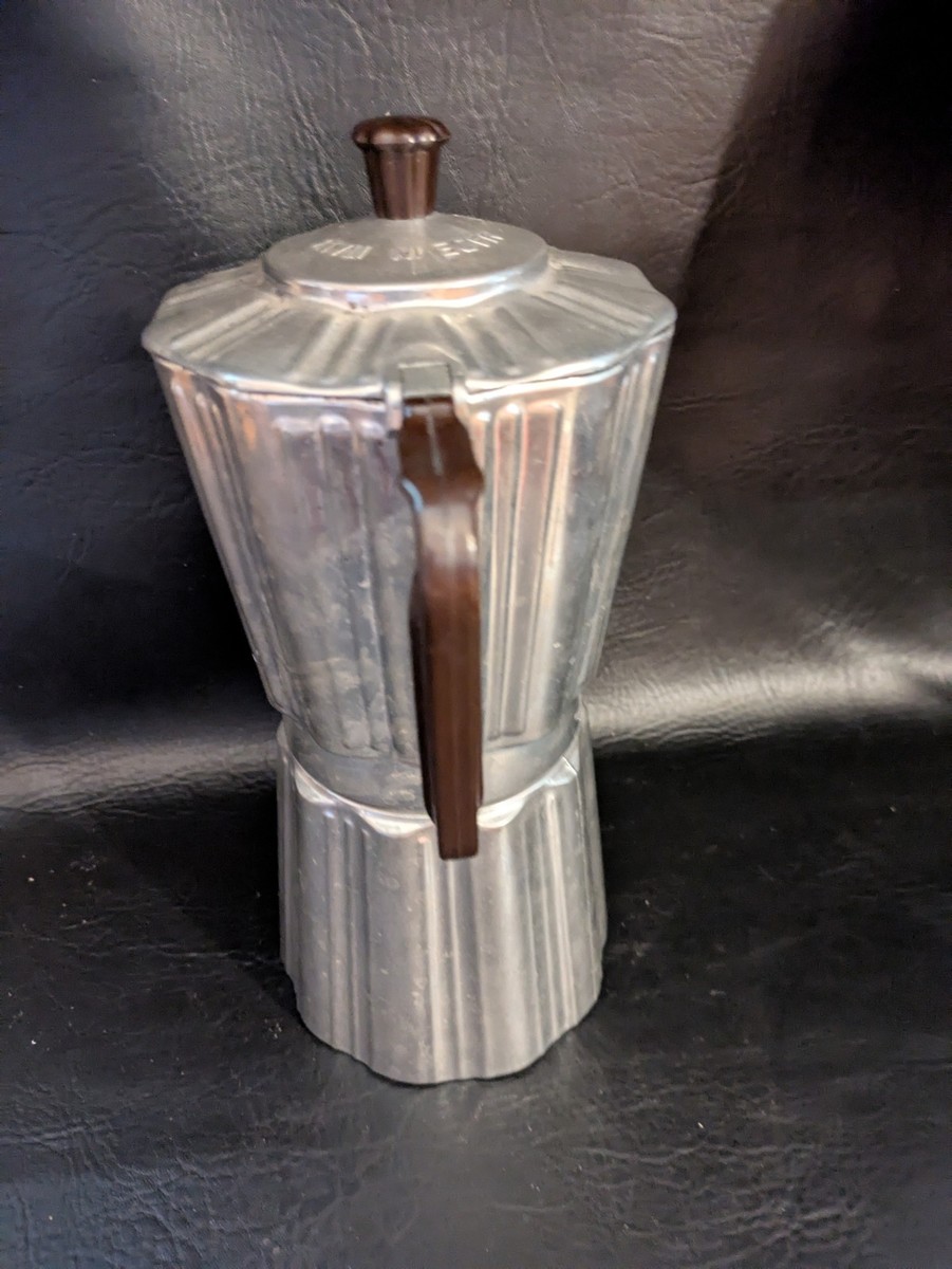 L'Albertini Superespresso Dolce Caffe Mocha Pot del 1960 e una macchina per caffe espresso vintage da piano cottura realizzata in alluminio in Italia. Questa moka, con una capacita di 6 tazze, e progettata per preparare un delizioso espresso utilizzando caffe macinato. Il colore argento e il design classico lo rendono un'aggiunta elegante a qualsiasi cucina, mentre la sua struttura resistente garantisce un uso duraturo. Perfetto per gli amanti del caffe che apprezzano il gusto ricco e aromatico dell'espresso.