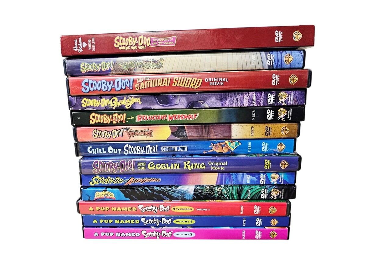 This lot of 13 Scooby Doo DVDs includes popular titles such as "The Mystery of the Black Belt", "The Reluctant Werewolf", and "Legend of the Vampire", among others. Released in the year 2000 by Warner Bros, these animated films are geared towards a children's and family audience. The DVDs are formatted in the DVD release year and have a rating of NR, making them suitable for all viewers. Enjoy hours of adventurous fun with this collection of Scooby Doo movies.