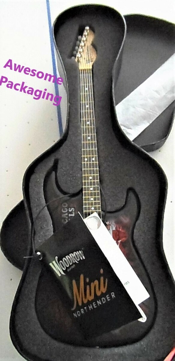 Each Woodrow NorthEnder is a miniature 1:4 scale replica model instrument can fit in the palm of your hand. It is approximately 10.5 inches in length and comes with an adjustable display stand and is packaged in a guitar case gift box. Each guitar is individually handcrafted from heavy duty ABS plastic and aluminum strings with metal tuning keys and metal plate located at the base of the neck on the guitar?s body. Beautifully packaged and all brand new.