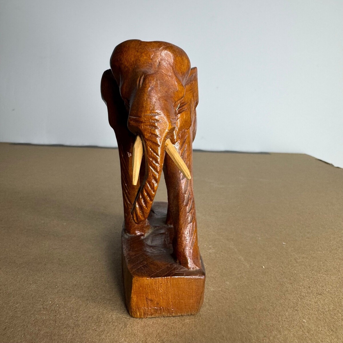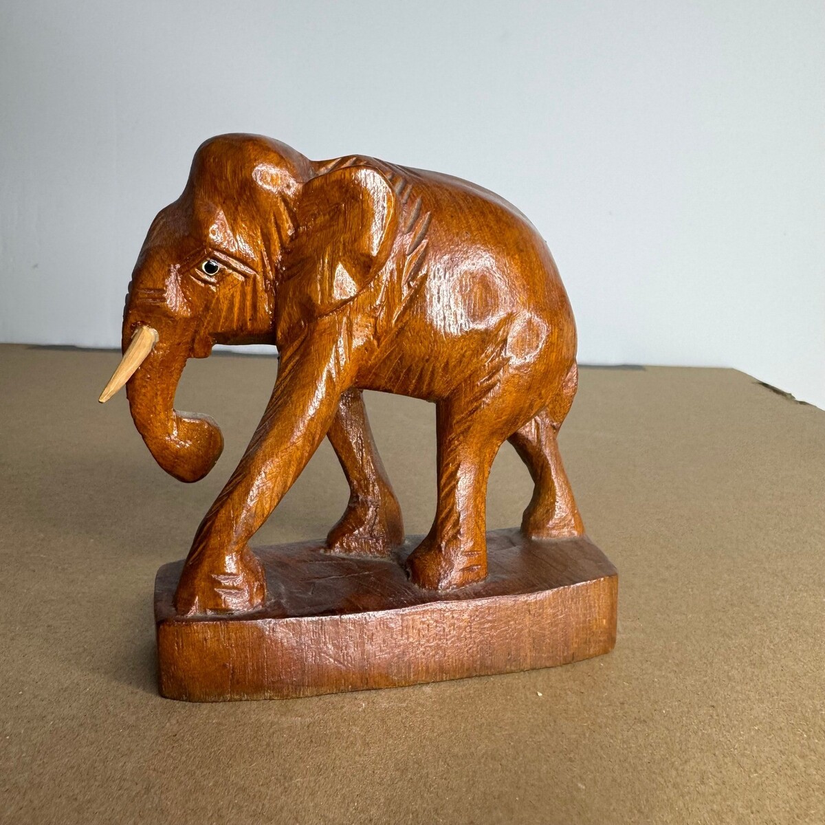Keywords: wooden elephant, elephant figurine, hand carved, wood sculpture, animal decor, vintage decor, home accent, desk accessory, shelf decor, collectible, gift, unique decor, art piece, carved wood