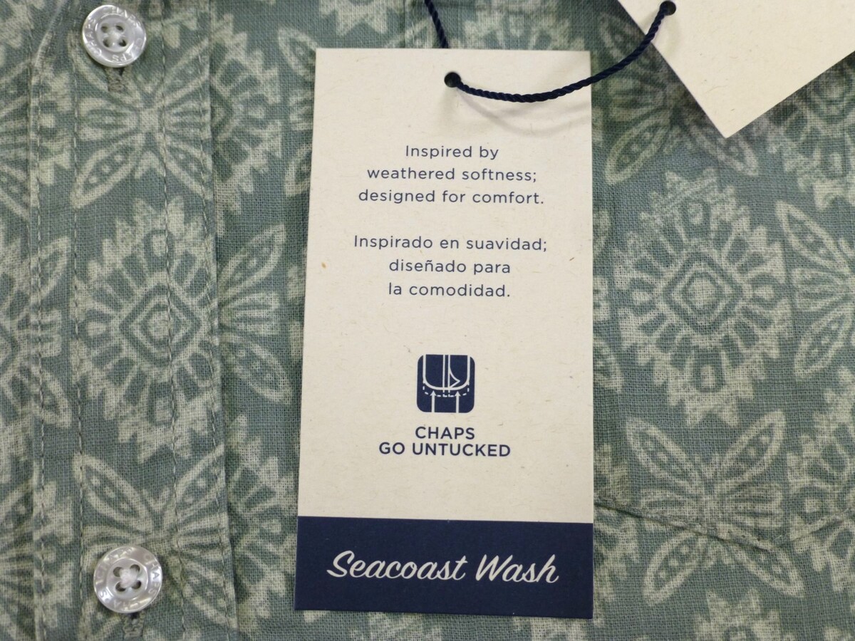 This shirt is so dashing, even your reflection will be jealous! Embrace the vintage vibes with Chaps' charming pattern, perfect for those who like to stand out by blending in with nature. The fairway green will make you feel like you're always on the green, no golf club required.