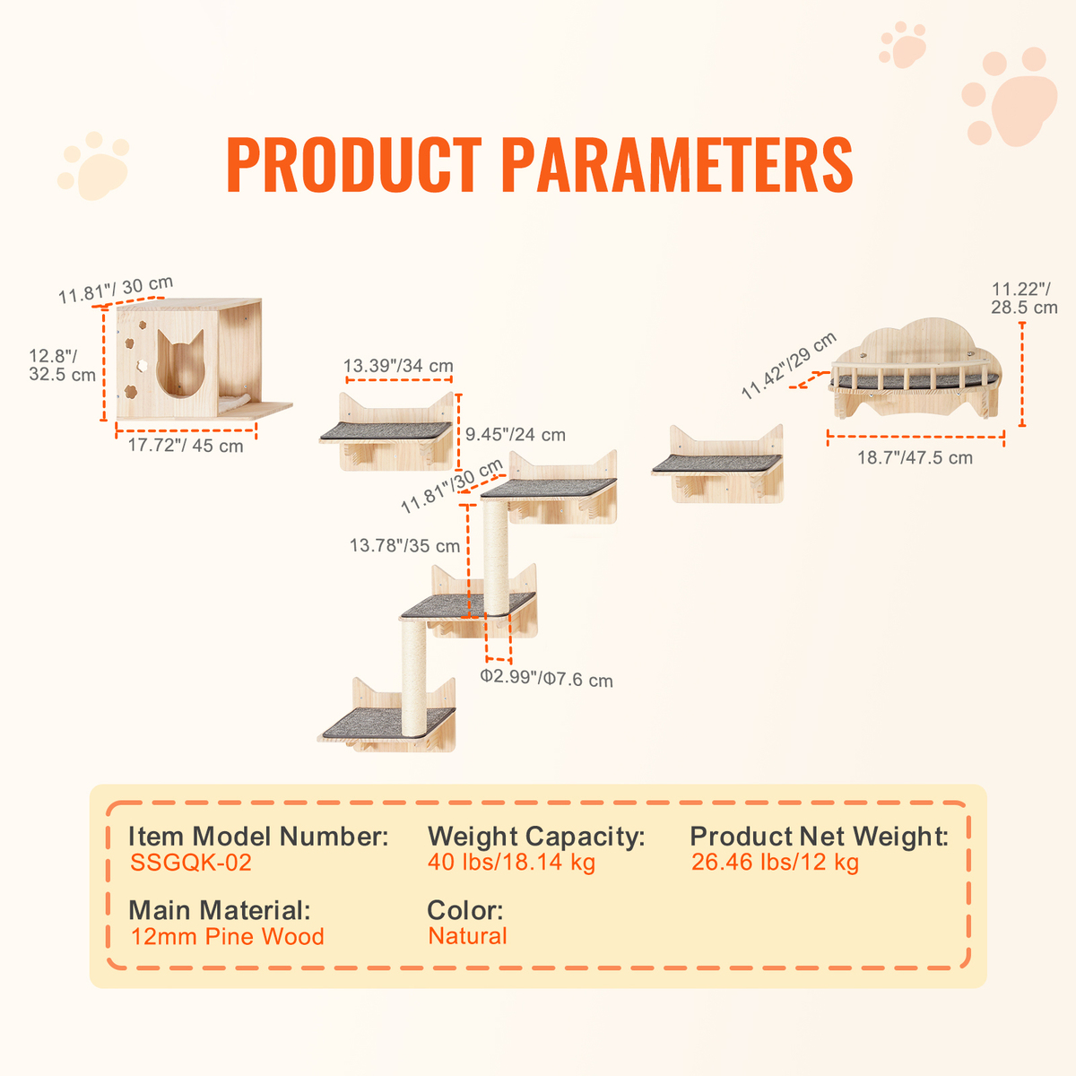 Versatile Use: Our cat wall furniture set can be freely arranged to suit different spaces and preferences. With its minimalist and cute design, the wall-mounted setup saves floor space and blends perfectly with your home decor, whether installed in the living room, bedroom, or patio wall.