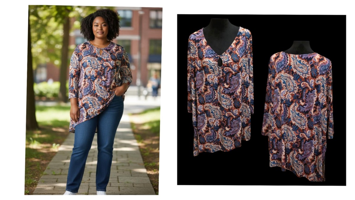 This stunning Cato blouse is the perfect addition to any wardrobe. The paisley pattern and vibrant colors make it a versatile piece that can be dressed up or down. The blouse features a flattering V-neckline and 3/4 bell sleeves, adding a touch of elegance to any outfit. With its lightweight and machine washable material, this blouse is perfect for any occasion, whether it's travel, casual outings or business meetings. The pullover closure ensures a comfortable fit, while the plus size option in Size 18/20W makes it accessible for women of all sizes. Don't miss out on this basic yet stylish addition to your collection....