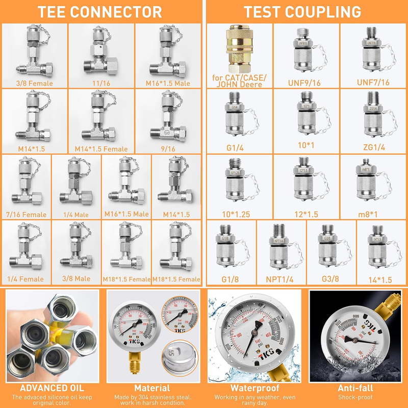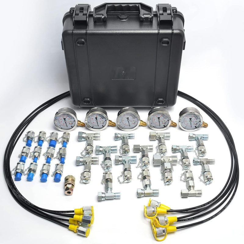 Hydraulic Pressure Test Kit with 5 Gauges (150/1500/3500/6000/9000 PSI) 14 Tee Connectors, Hydraulic Pressure Gauge Set with 5 Test Hoses 13 Couplings for Excavators.