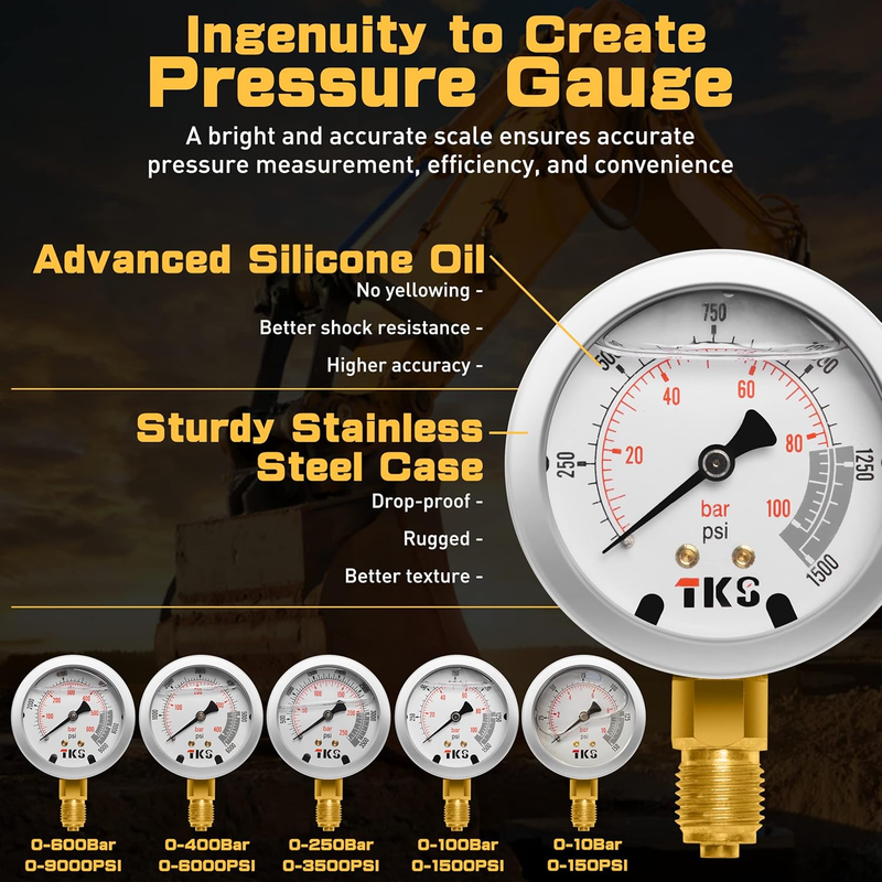 ?High-grade Silicone Oil?Our Excavator Pressure Gauges have built-in high-grade silicone oil, which will not turn yellow, has better shock resistance and higher accuracy.