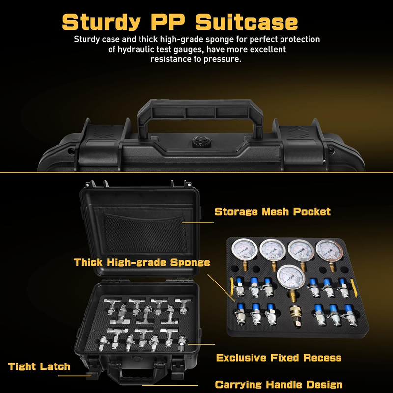 ?Complete Kit?Comes with 13 x Couplings, 14 x Tee Connectors, 5 * 61.5'' Test Houses, 5 x Pressure Gauges, and 1 x Sturdy PP Suitcase.