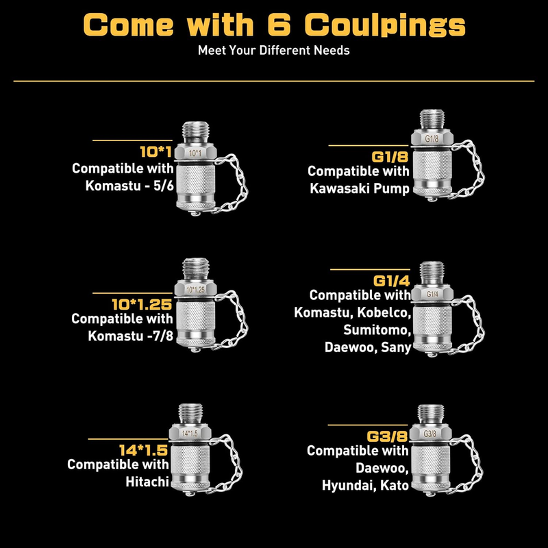 Equipped with 6 couplings, compatible with Caterpillar, Hitachi, Komutsu, Daewoo, Hyundai, Kato, Kawasaki, etc.
