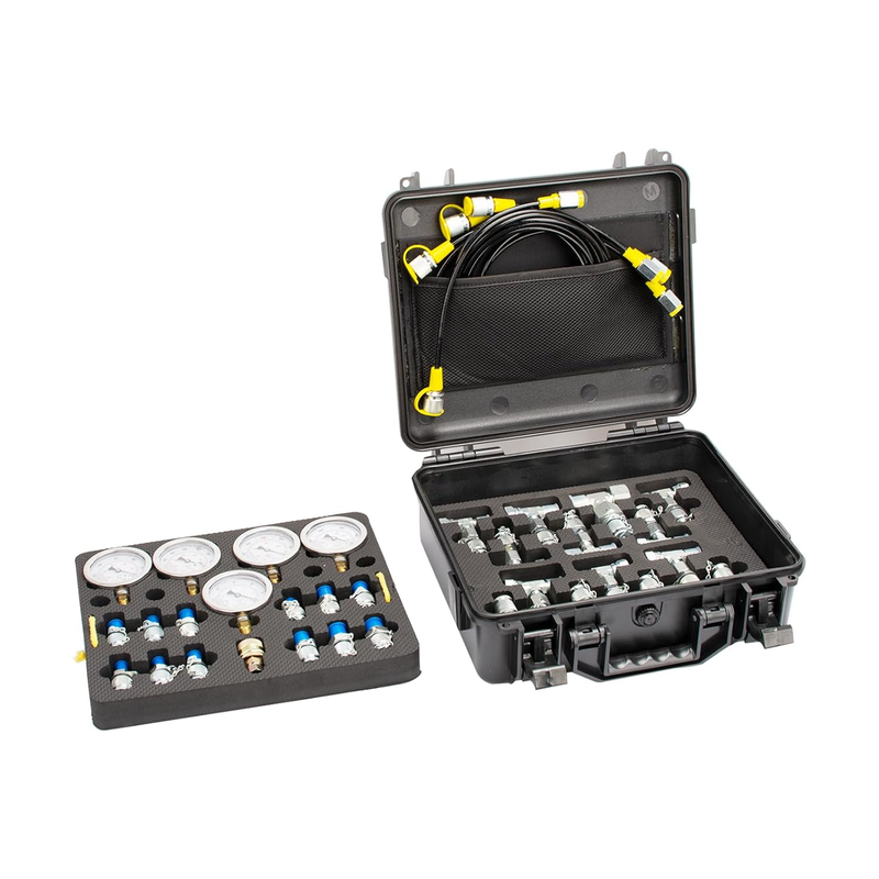 ?JAHEZYAN Hydraulic Pressure Test Kit?Include 5 Hydraulic Test Guages, 12 Couplings, 1 Carter Quick Connector , 14 Tee Connectors, 5 Test Hoses of 61.5inch and 1 Sturdy PP Suitcase.