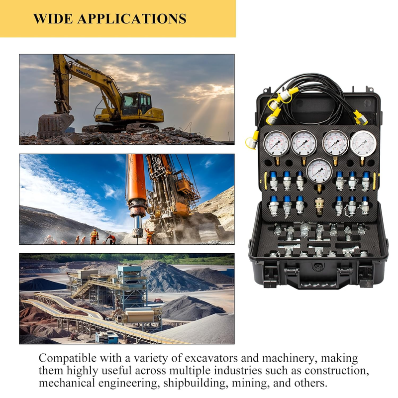 ?Wide Applications?The Hydraulic pressure gauge kits are compatible with a variety of excavators and machinery, making them highly useful across multiple industries such as construction, mechanical engineering, shipbuilding, mining, and others.