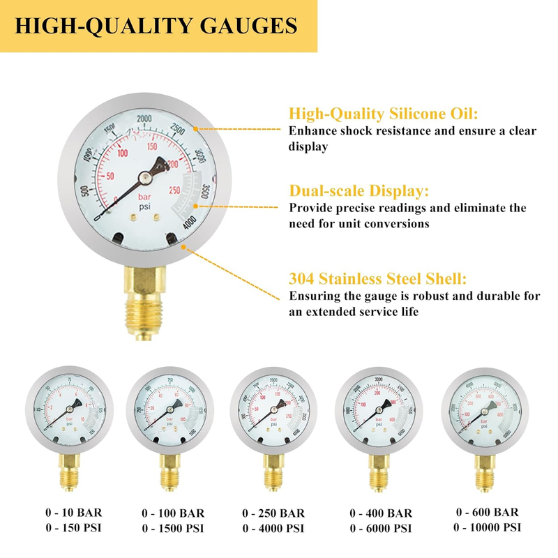 ?High-quality Gauges?The hydraulic gauges feature a 304 stainless steel shell and copper screw joint, ensuring the gauge is robust and durable for an extended service life. High-quality silicone oil is also included to enhance shock resistance and ensure a clear display. The clear dual-scale displays provide precise readings and eliminate the need for unit conversions, making it easier to obtain accurate measurements directly.