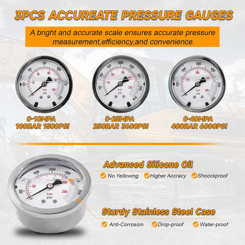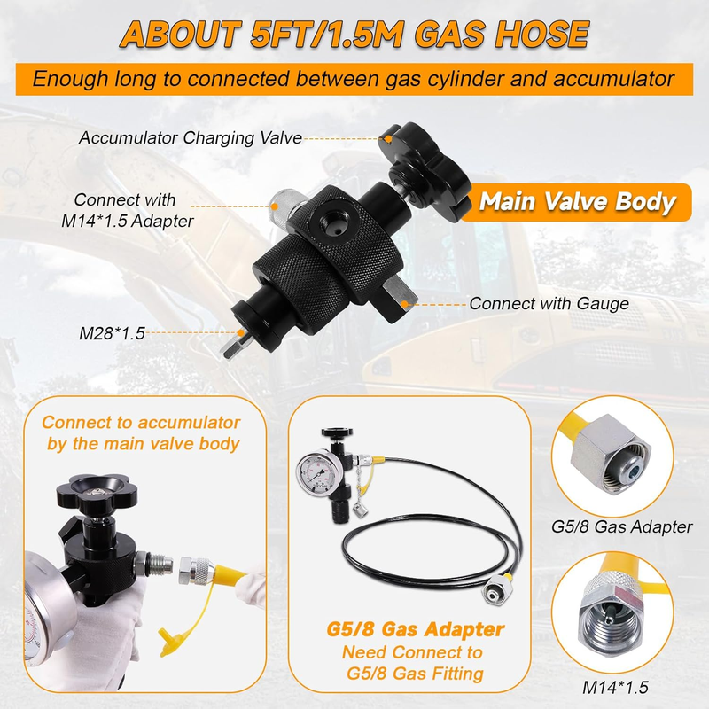 ??Widely Appication?Hydraulic Nitrogen Accumulator Charging Kit is designed for hydraulic accumulator nitrogen charging filling and Pressure Test Kit and can be suit most brand accumlator
