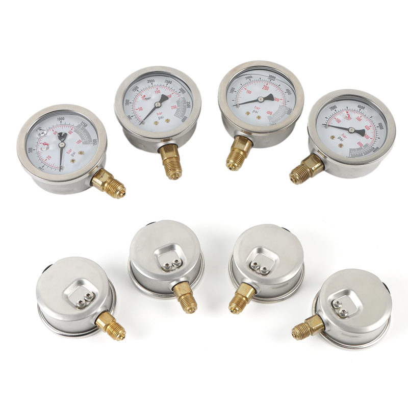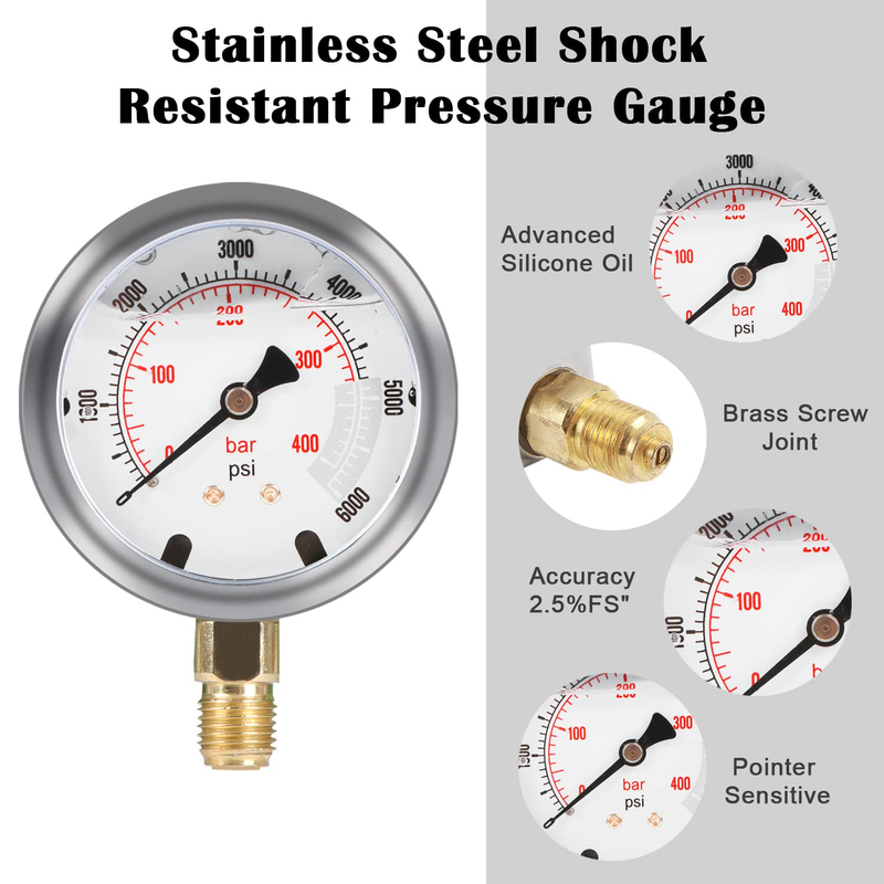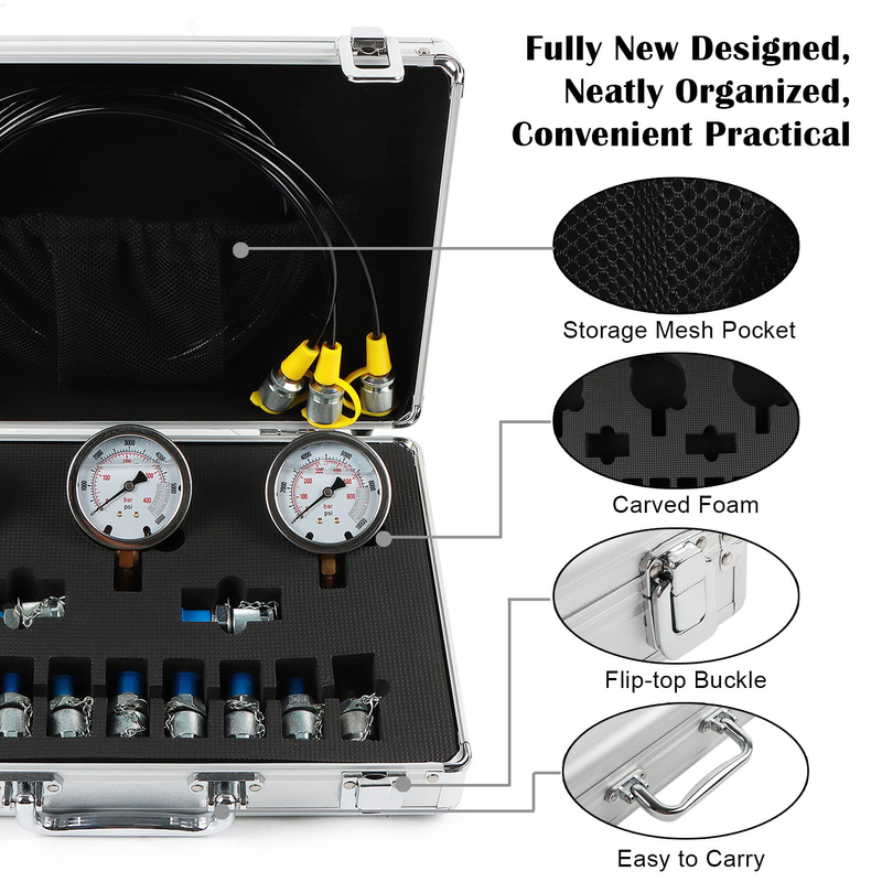 ?Pressure Gauge: The hydraulic gauge kit has 4 pressure gauges of different ranges: 0-1500psi/10MPa, 0-4000psi/25MPa, 0-6000psi/40MPa, 0-10000psi/60MPa.