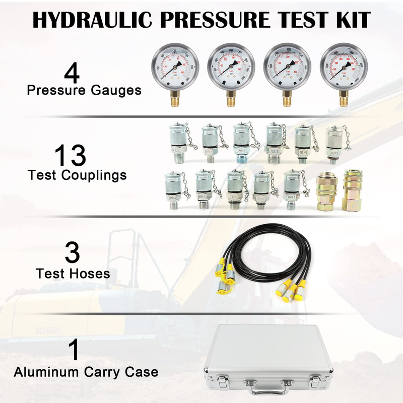 ?Test Coupling: 13 test couplings, with the sizes of R1/4, G1/4, G1/8, G3/8, M8*1, M10*1, M10*1.25, M12*1.5, M14*1.5, UNF7/16-20, UNF9/16-18, 2xQuick Connector. Suitable for John Deere, CAT, Komatsu, Hitachi, Daewoo, Hyundai, etc.