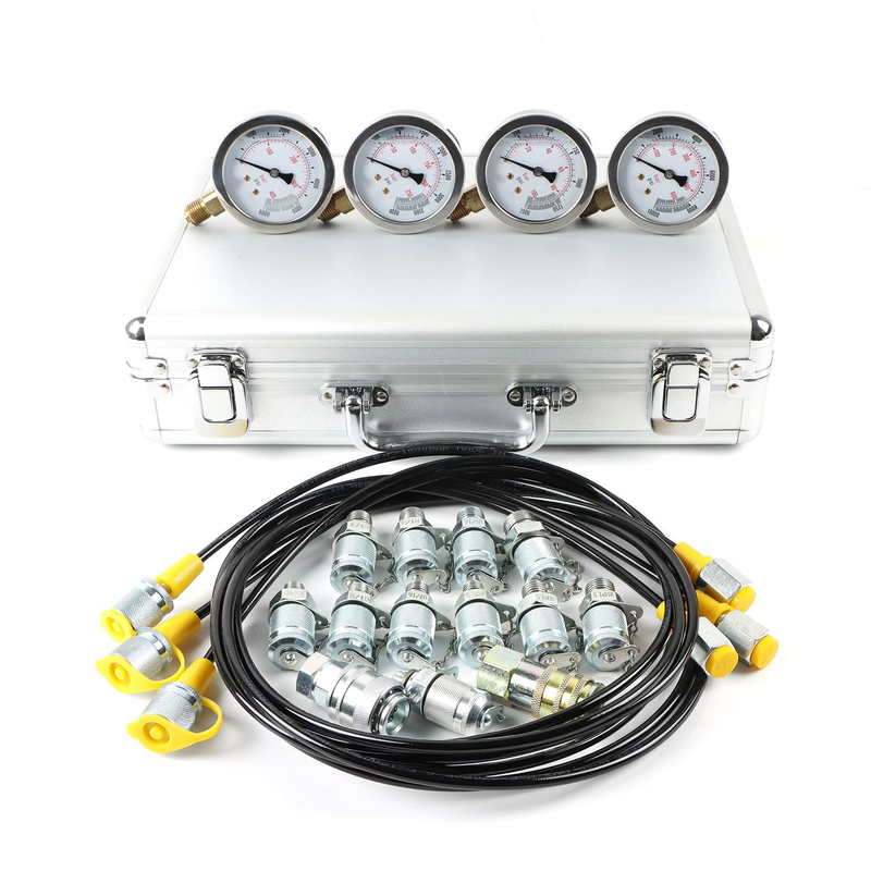 Hydraulic Pressure Test Kit 100/250/400/600Bar, 4 Gauges 13 Couplings 3 Test Hoses Hydraulic Gauge Kit for Excavator Construction Machinery Ships Mine