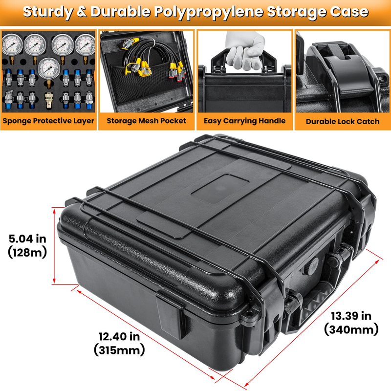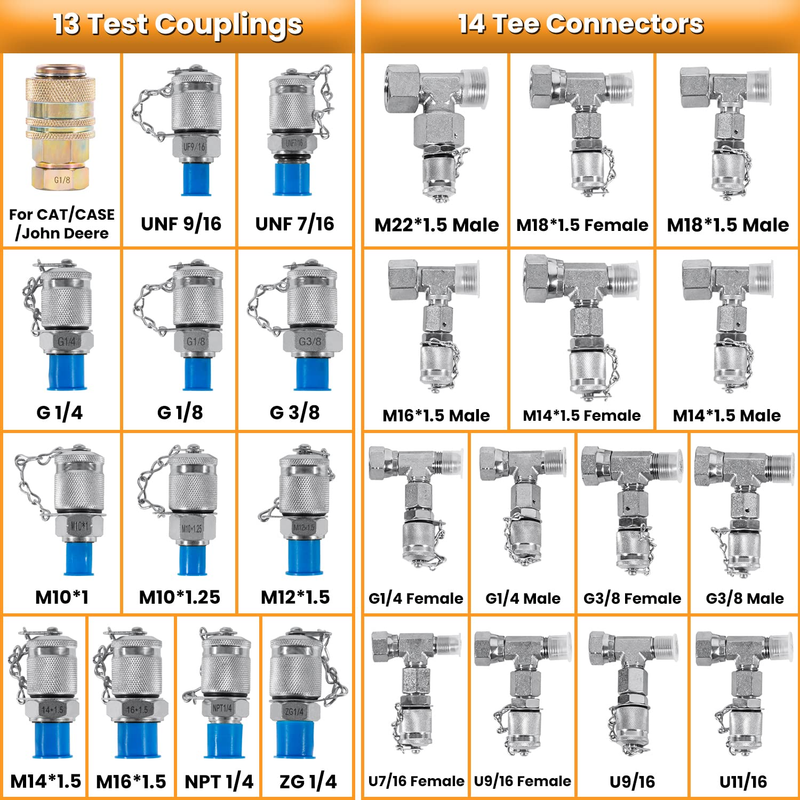 Includes ? 5 Different Pressure Range Analog Gauges: 10BAR/150PSI/1MPa, 100BAR/1500PSI/10MPa, 2500BAR/4000PSI/25MPa, 400BAR/6000PSI/40MPa, 600BAR/9000PSI/60MPa | 13 Type Test Couplings: G1/4, G1/8, G3/8, M10*1, M10*1.25, M12*1.5, M14*1.5, M16*1.5, UNF7/16, UNF9/16, NPT1/4, ZG1/4, Quick Connector (BSP1/8F) | 14 Type Test Connectors: 1/4 Male; 1/4 Female; 3/8 Male; 3/8 Female; 7/16 Female; 11/16; 9/16 Female; 9/16; M16*1.5 Male; M18*1.5 Male; M18*1.5 Female; M14*1.5; M14*1.5 Female; M22*1.5 Male | 5 Test Hoses and a Sturdy Polypropylene Carrying Case.