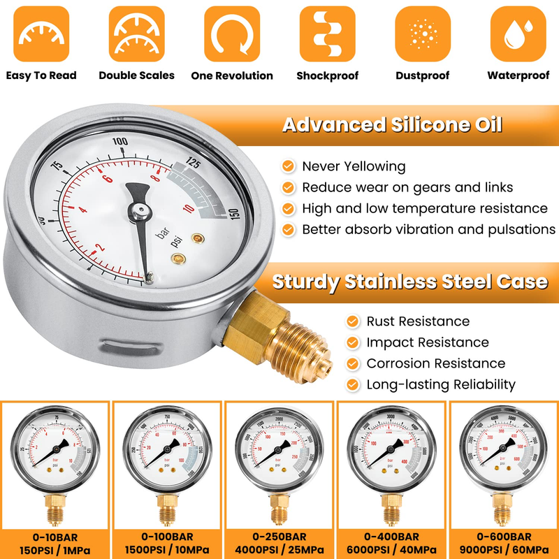 These hydraulic pressure gauges have high accuracy, high efficiency and perfect stability, with polycarbonate glass dial face for scratch resistance with anti-glare finish. It is flexible use, simple operation, easy debugging, safety and reliability. Can be used to measure gas, liquid, oil and non-corrosive mediums of stainless steel.