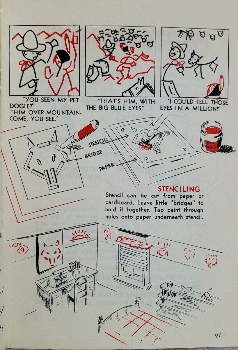 Cover has lots of fading and wear. Some sections are lightly filled out in this book throughout but the majority of writing occurs on the first few pages. Really great red and black graphics throughout. Awesome illustrations. Arm sleeve cut out still on tact on back inside cover. Really cool piece of history from the BSA Boy Scouts of America