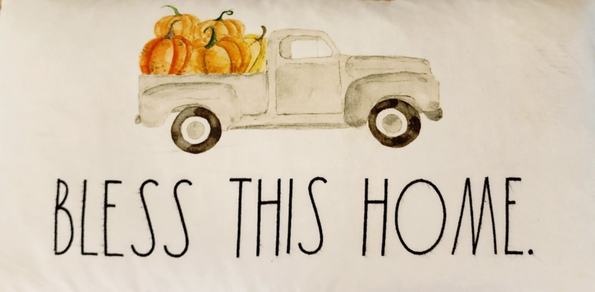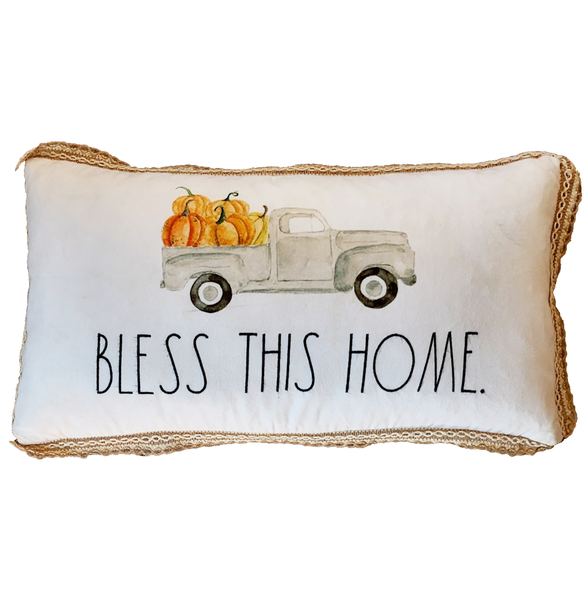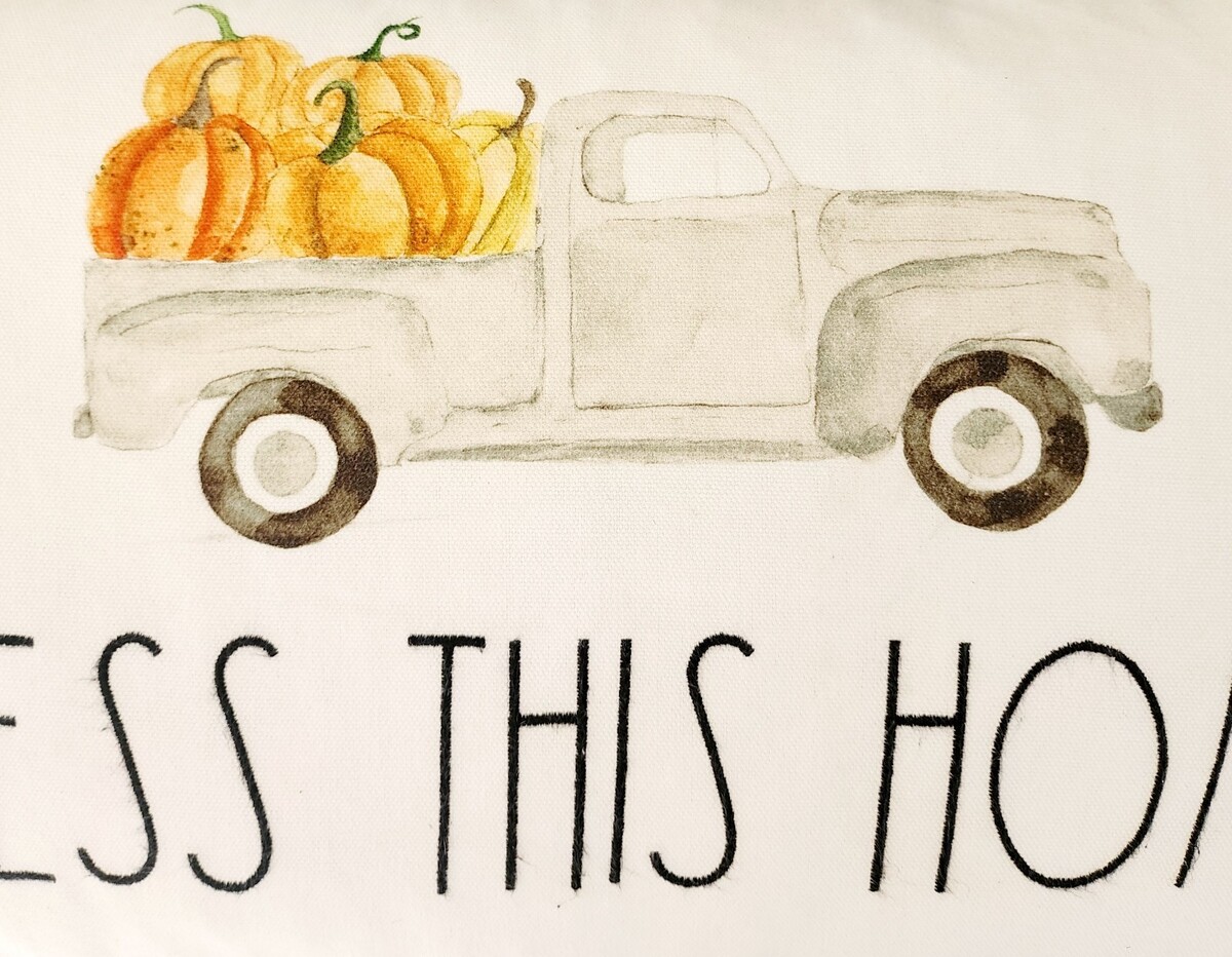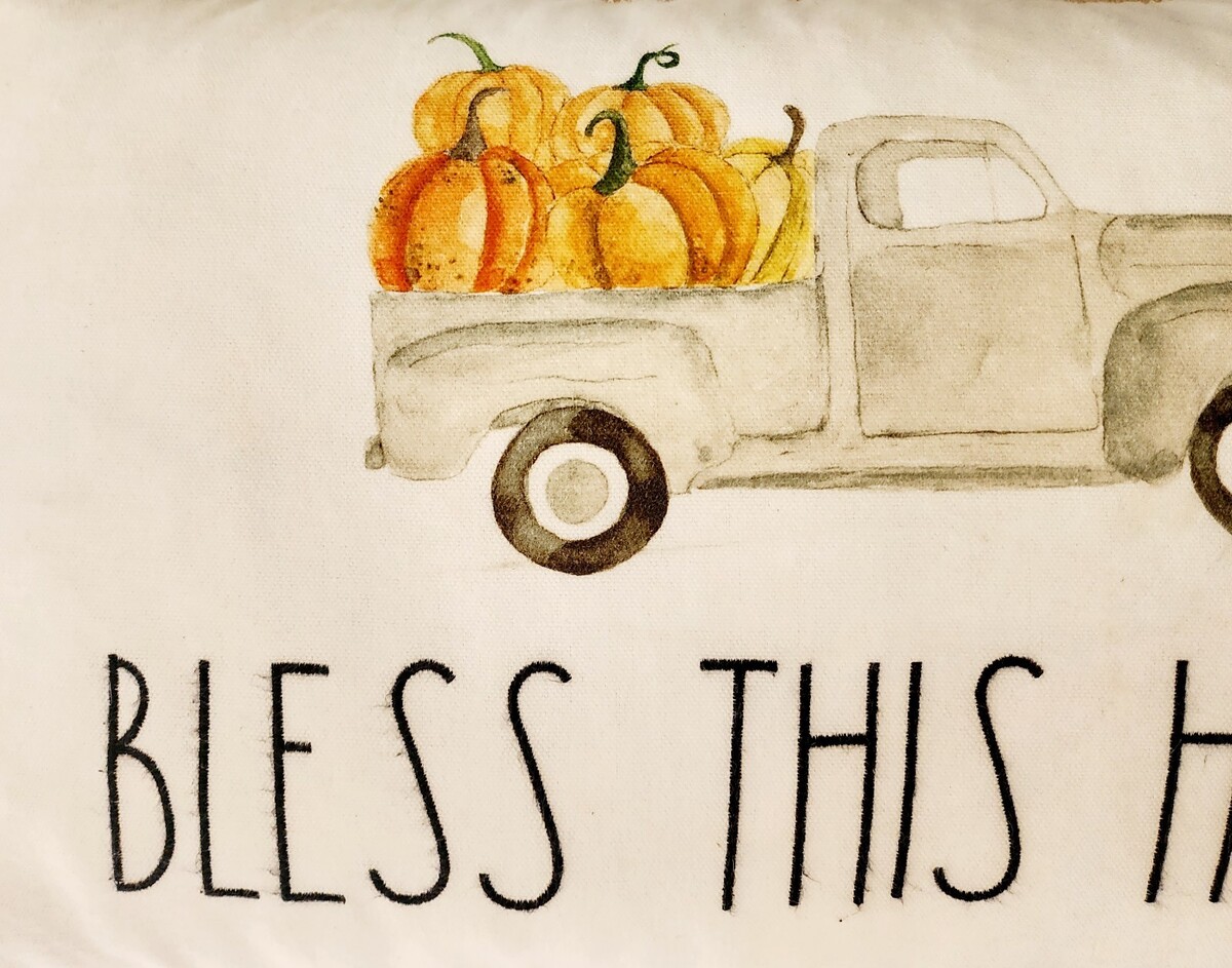 RAE DUNN Fall Pillow Bless This Home Farm Truck Pumpkins 24"x14" Used INVRM