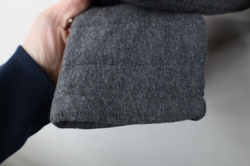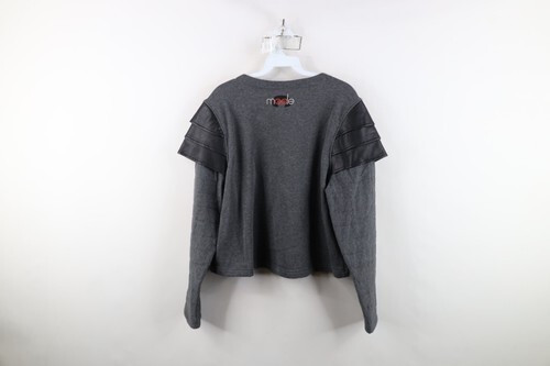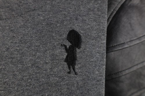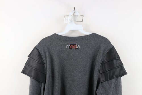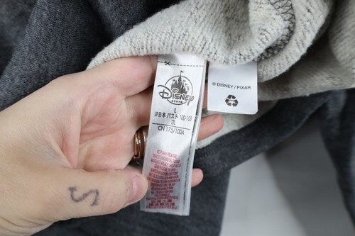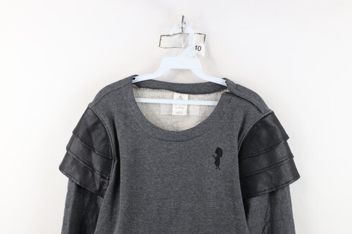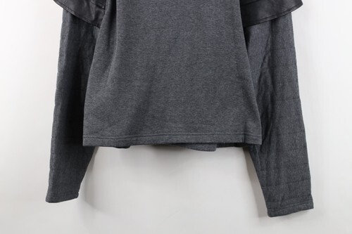 Dark spots, pilling. Shoulder trim distressed. Loose threads inner bottom lining. Designs distressed. Collar, cuffs discolored. Color faded