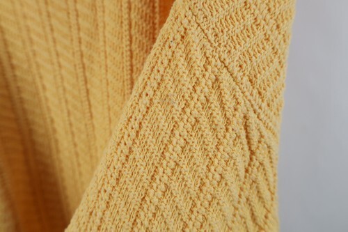 Blemish left arm. Shoulders stretched. Collar, cuffs discolored. Color faded. Pilling. Made in USA