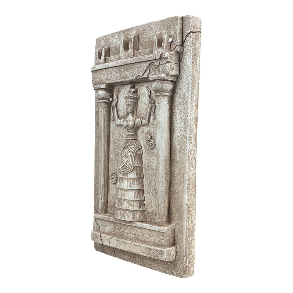 Diese wunderschone Reliefskulptur der minoischen Schlange Muttergottin ist ein einzigartiges und markantes Stück antik inspirierter Kunst. Handgefertigt aus hochwertigem Terrakotta, verfügt es über komplizierte Details, die an den ikonischen minoischen Stil erinnern. Die Skulptur zeigt die verehrte Schlangenmuttergottin, ein Symbol für Fruchtbarkeit und Schutz in der alten minoischen Kultur. Ideal für Sammler oder als Statement-Stück für Ihr Zuhause, bringt diese kleine Wandskulptur einen Hauch von Geschichte und Kunstfertigkeit in jeden Raum.
