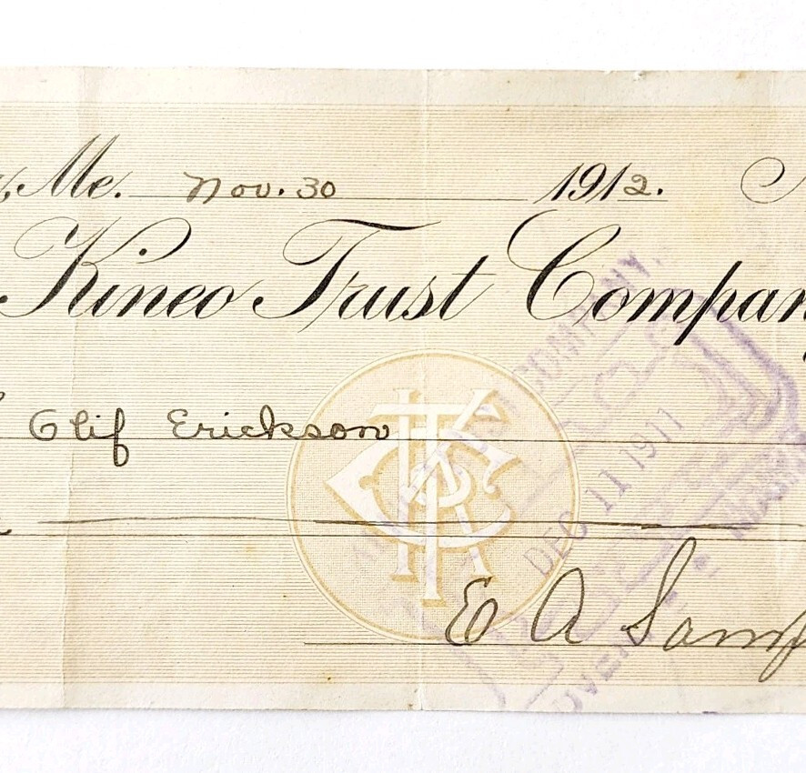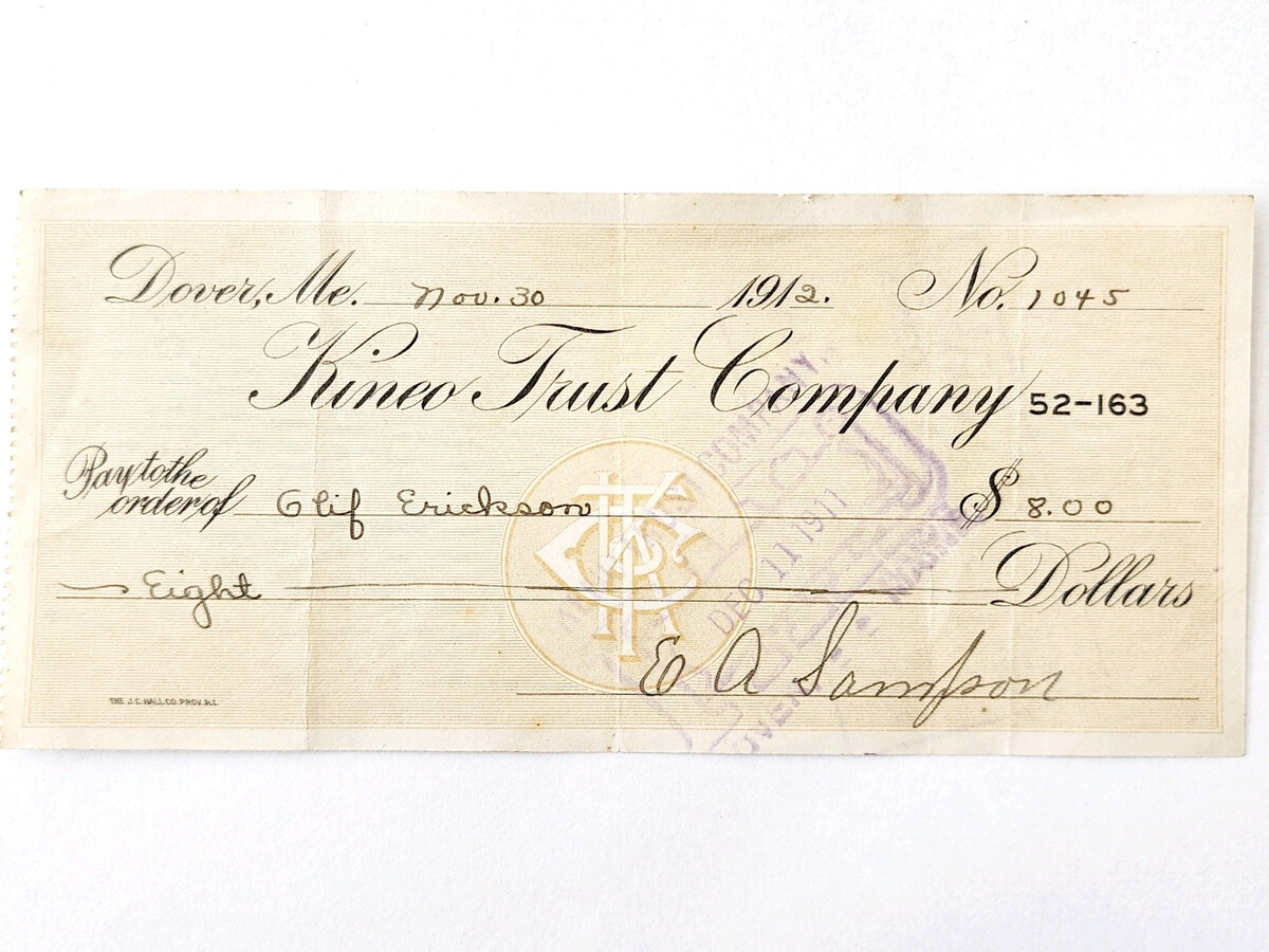 1912 Kineo Trust Company Bank Check E.A. Sampson Dover Maine Signed 1045 CHX4