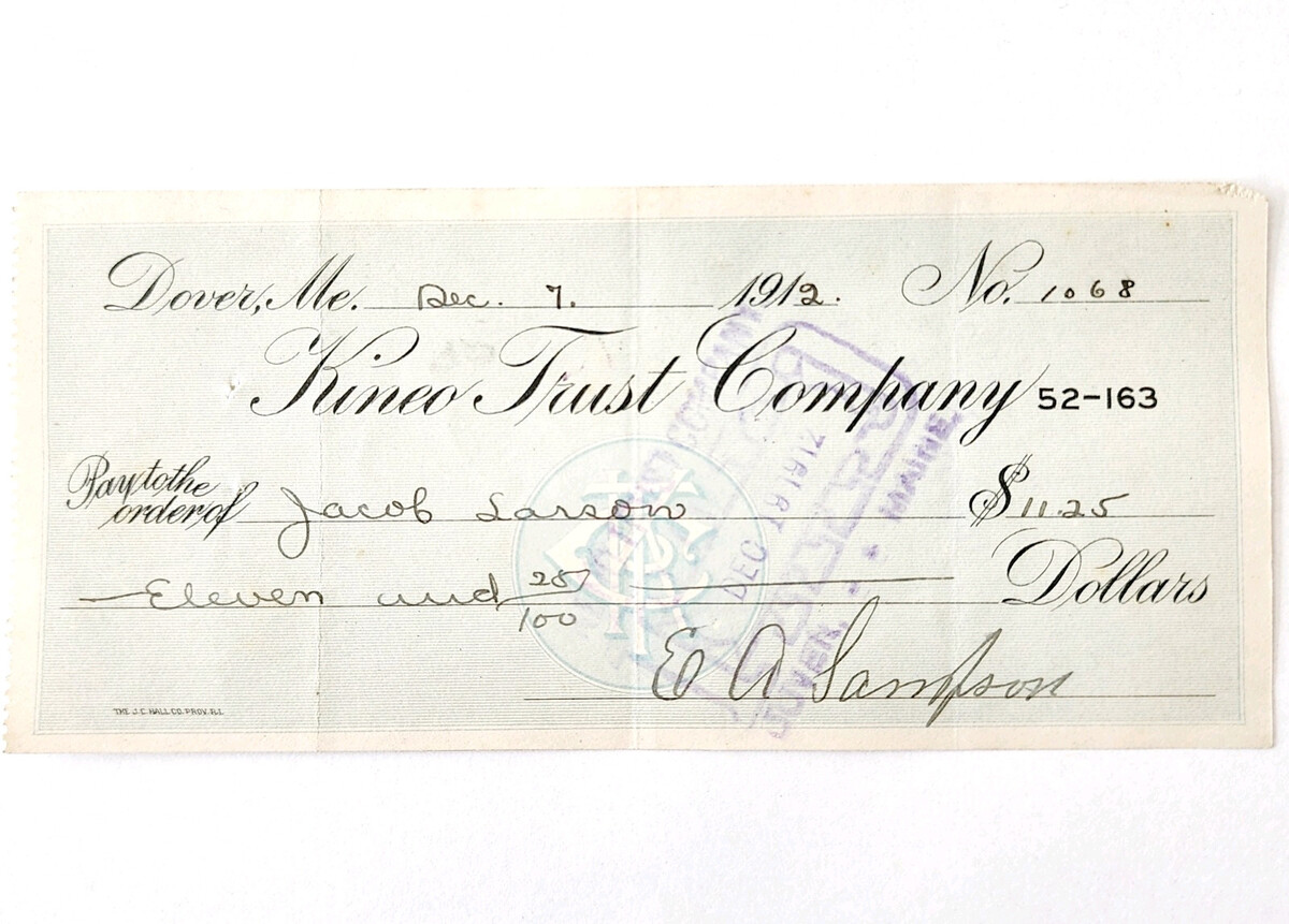 1912 Kineo Trust Company Bank Check E.A. Sampson Dover Maine Signed 1068 CHX3