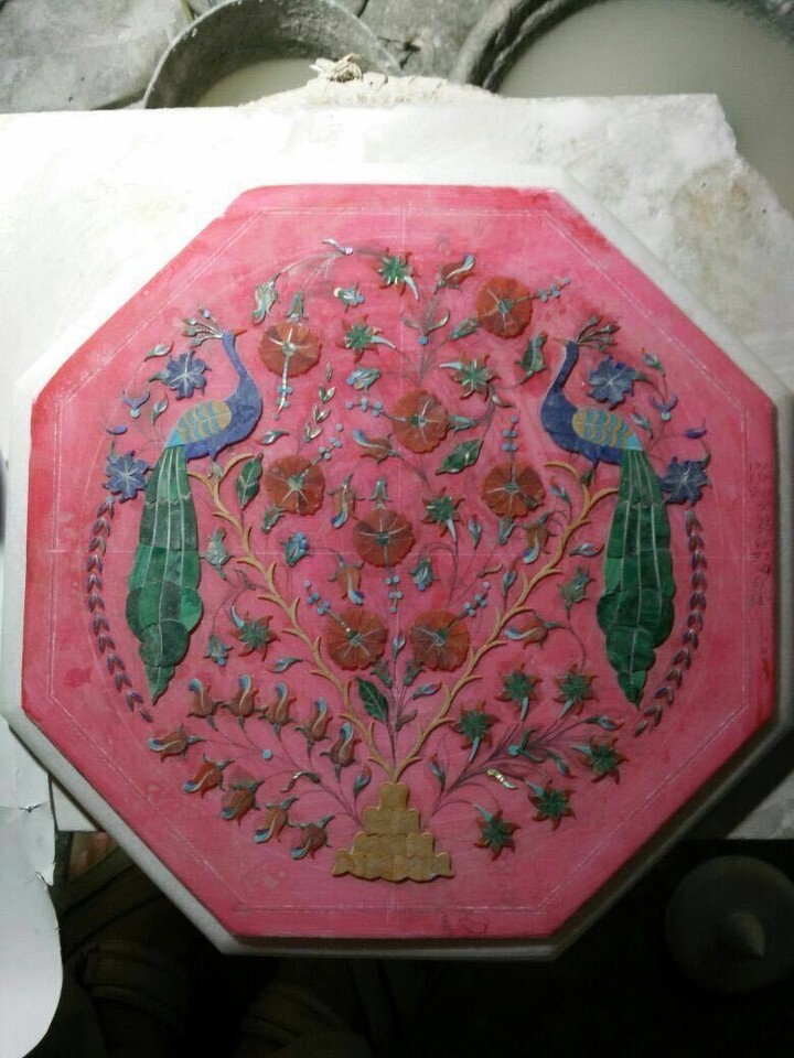 This beautiful art is a dying art of Agra,India the artisans those make this beautiful art are the descendants of those families who built the Tajmahal in 17 century Tajmahal is a monument of love you can easily see the artwork done with the same technique on the walls of the Tajmahal.