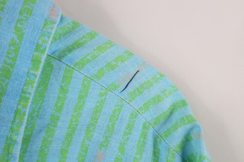 Button hole ripped front top. Bottom button replaced. Stain left shoulder. Sun faded. Graphics, color faded. Collar, arms discolored. Color faded. Pilling. Made in USA