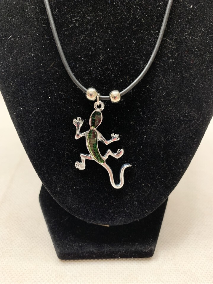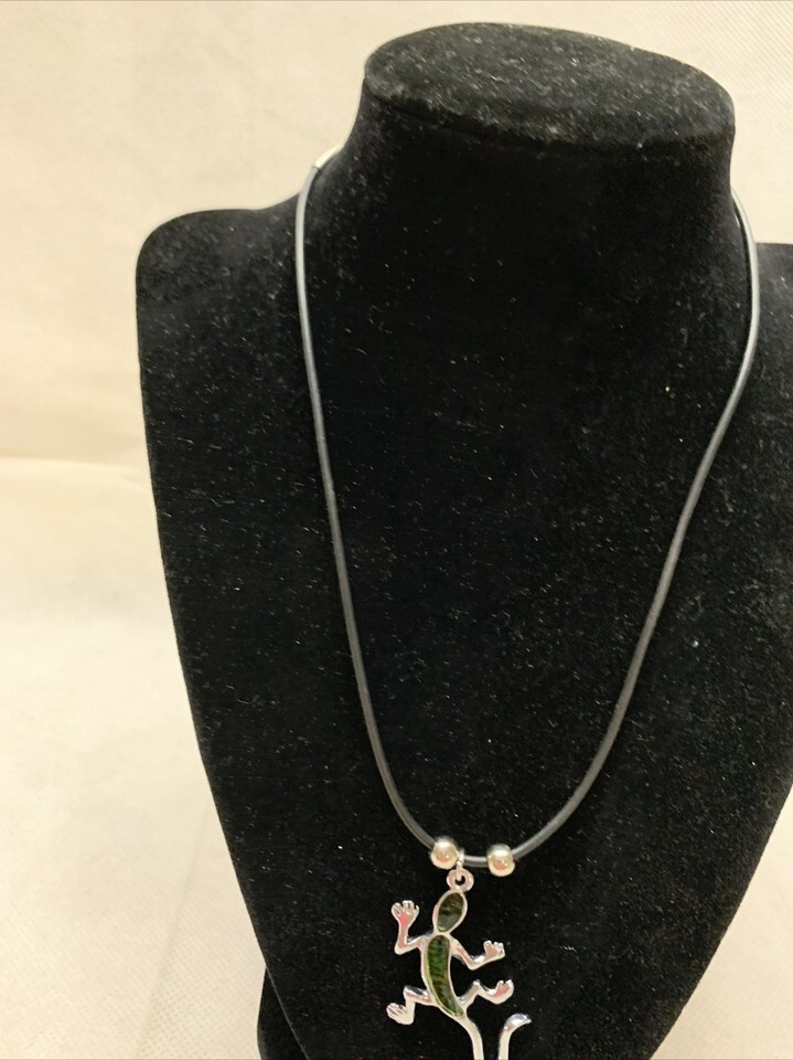 9? cord necklace. 2? long lizard charm. Charm is silver toned with hues of blues and green. Please see pictures for details.