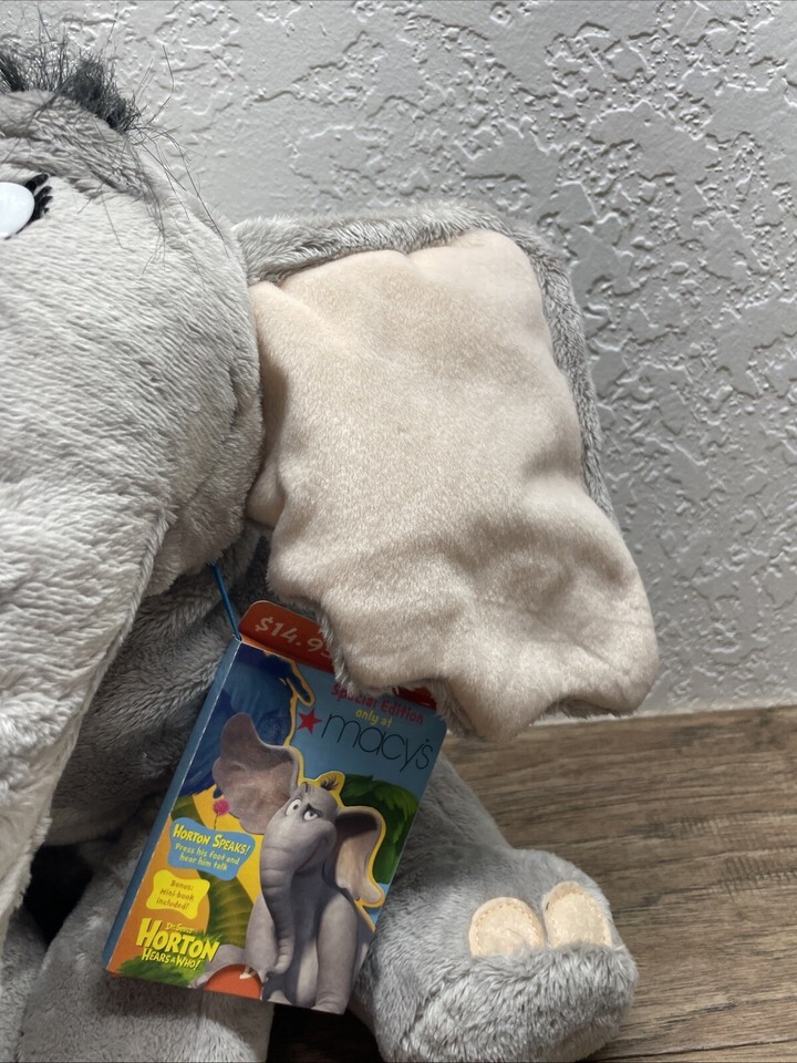 Good displayable condition. Book is attached and is still in the box. There is no sound coming from Horton, and no place to put any batteries. Embroidered Macy's 2008 on his foot. Please see pictures for condition details and measurements.
