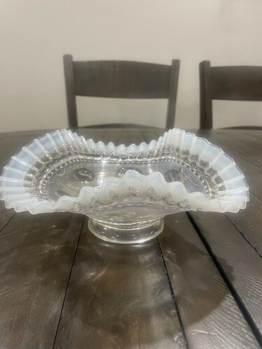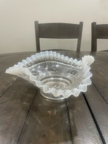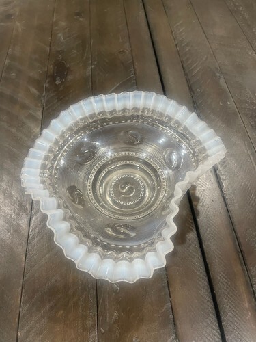 EAPG Jefferson Glass Co. "Astro" White Opalescent 8” Crimped Ruffled Bowl c.1904