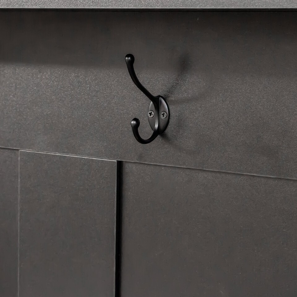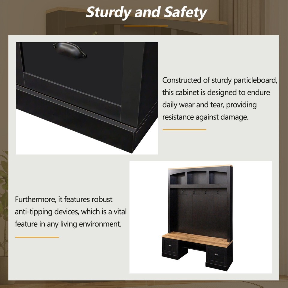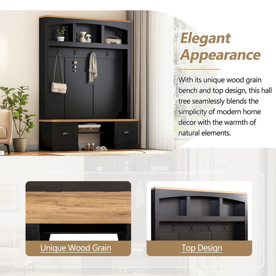 The 4-in-1 design integrates seating, hooks, open storage space, and bottom cabinets with adjustable shelves inside, significantly enhancing the functionality of this hall tree. Whether it's serving as a temporary stool for hanging up hats and bags upon entering, or accommodating different items that need to be displayed or stored, this versatile hall tree easily accommodates all, keeping your entrance area neat and orderly.