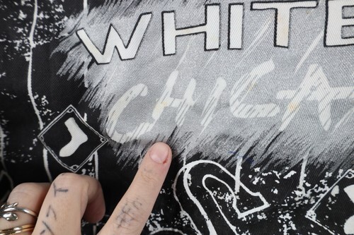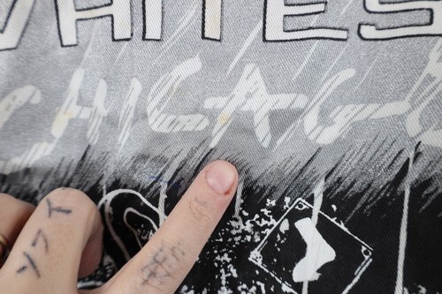 Discolored/stained right side. Stains front, arms, back top. Collar discolored. Graphics/color faded. Pilling. Loose threads tag